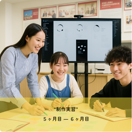 スマートフォンやタブレットなど、さまざまな端末に対応した マルチデバイスなWebサイト(レスポンシブWebデザイン)制作を学習し、 実店舗のWebサイトを模擬的に依頼された案件として制作するほか、 就職活動に必須アイテムとなっているポートフォリオ(作品集)サイトなどを、 Webサイトの企画・デザイン・コーディングという6か月間の集大成となる制作を行います。